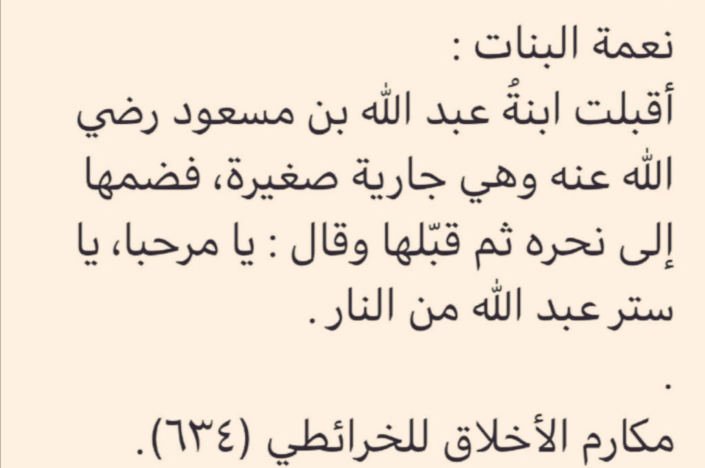 أ منية سيف On Twitter أقبلت ابنة عبدالله بن مسعود رضي الله عنه وهي جارية صغيرة فضم ها إلى نحره ثم قب لها وقال يا مرحبا يا ستر عبدالله من النار مكارم الأخلاق